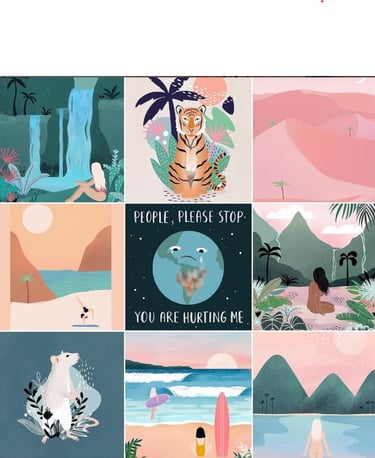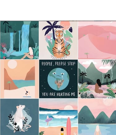 Plakaty, grafiki wyrażające wewnętrzne przeżycia, milość do zwierząt, wspierające świadomość zdrowia psychicznego.